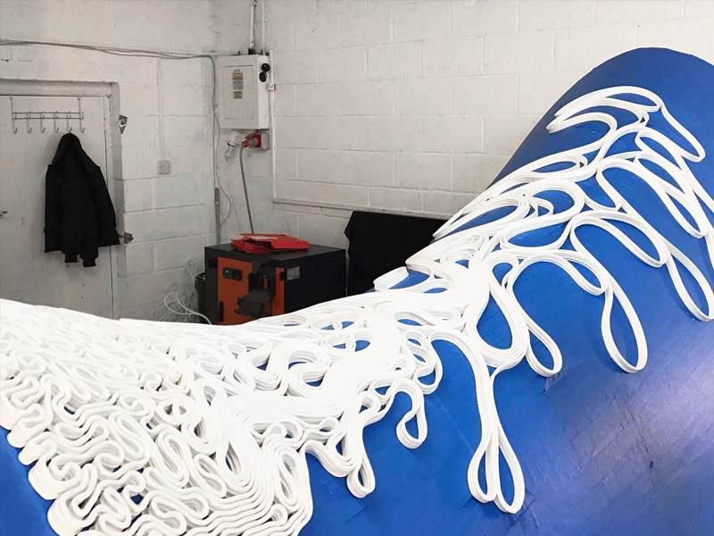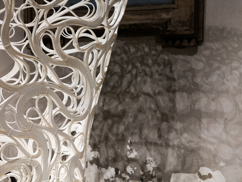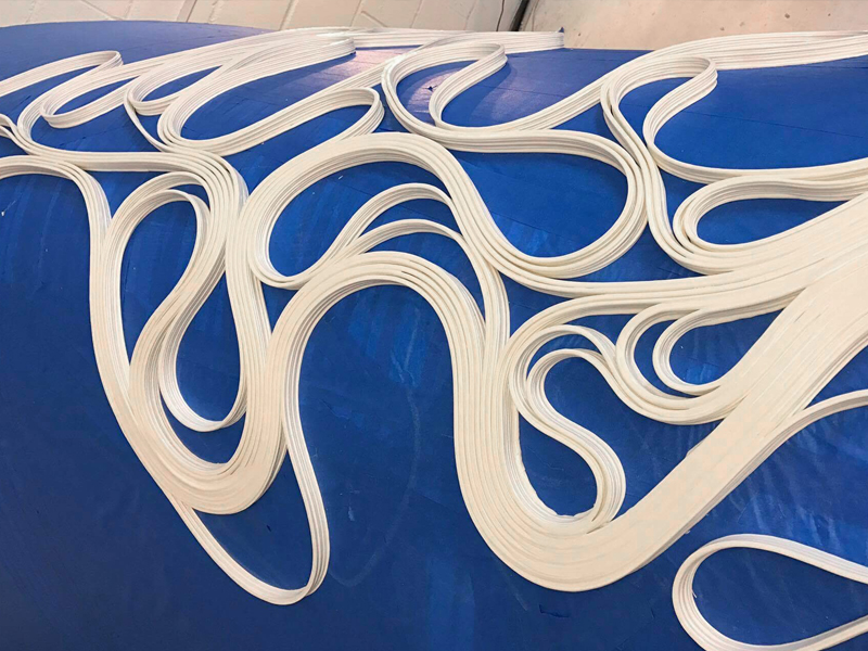 Six-axis robotic 3D printing technology created the 7km extruded structural strip as a continuous line that repeatedly loops to connect with itself on a ruled surface. Ruled surfaces are a class of surfaces generated by the movement of a straight line in space around an axis, and have been applied in the fabrication process of the piece. Its shape is tailored to a trimmed cylinder that enables a hot-wire cutting process to create the mould of the base on which the continuous structural strip has been robotically 3D printed.