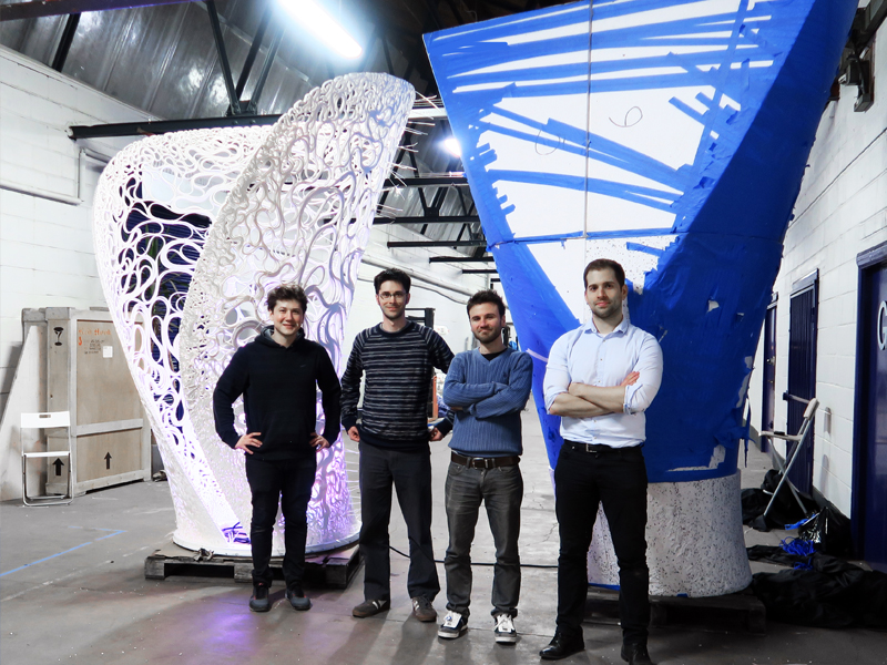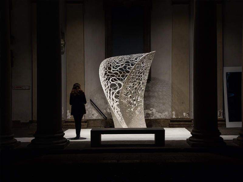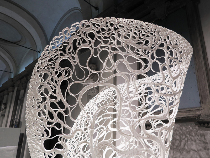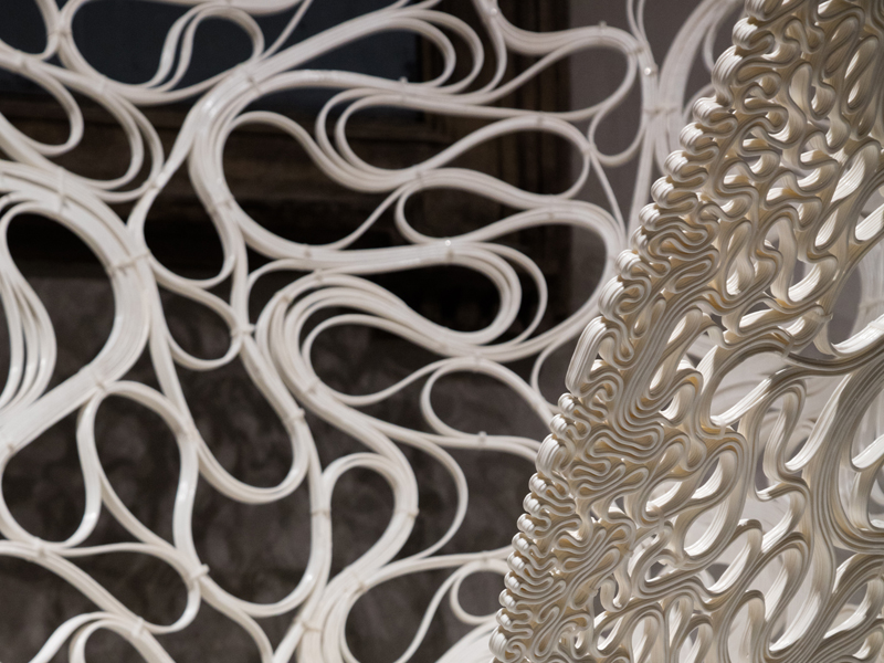 Created by automated additive manufacture as well as hot-wire cutting technology, the structure presents the on-going investigations into robotic assisted design undertaken by Zaha Hadid Architects’ Computational Design (ZHA CoDe) research group; demonstrating what can now be achieved in terms of mechanisation and customisation in the architecture, construction and engineering industries.